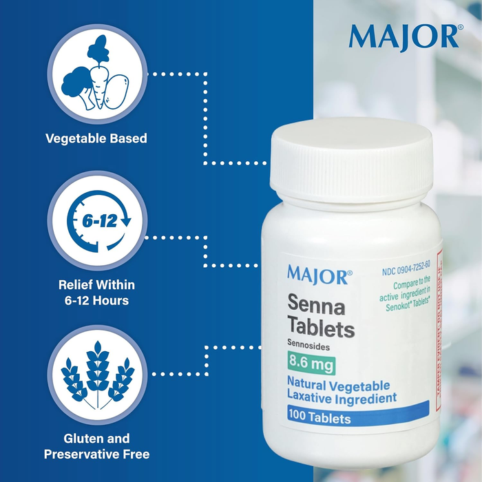 senna laxative tablets 8.6 mg, Major Senna-Lax 100 count, natural constipation relief, vegetable laxative for adults, overnight laxative tablets, senna tablets for gentle relief, stimulant-free laxative