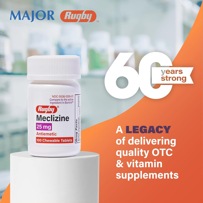 meclizine 25 mg chewable tablets, Rugby meclizine for motion sickness, vertigo relief chewable tablets, travel nausea medicine, antihistamine for dizziness, over-the-counter motion sickness relief, meclizine for inner ear balance